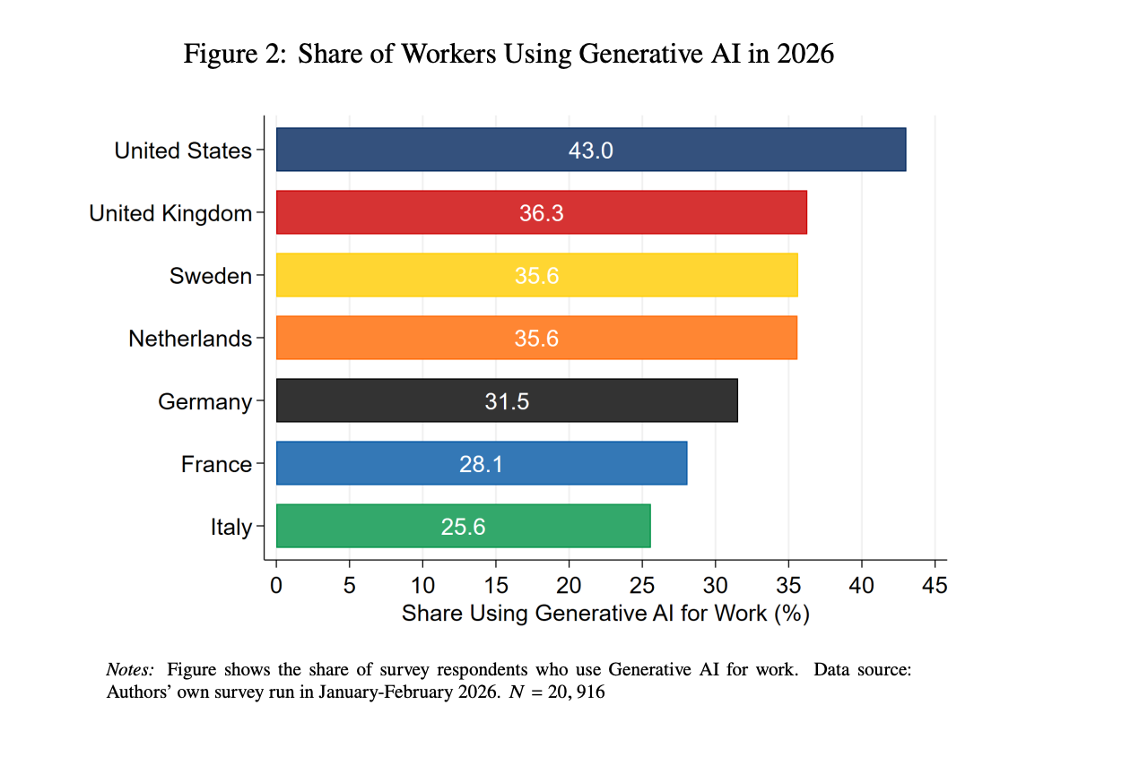 Not just us: The challenge is global, with Britain’s adoption rate only a little behind that of businesses in the US, where the Census Bureau estimated AI uptake of 17.5 percent. But usage can also be slippery to pin down depending on the metric used. Another survey suggests that 36 percent of British workers are using generative AI for their job, behind the US but on a par with other European countries.